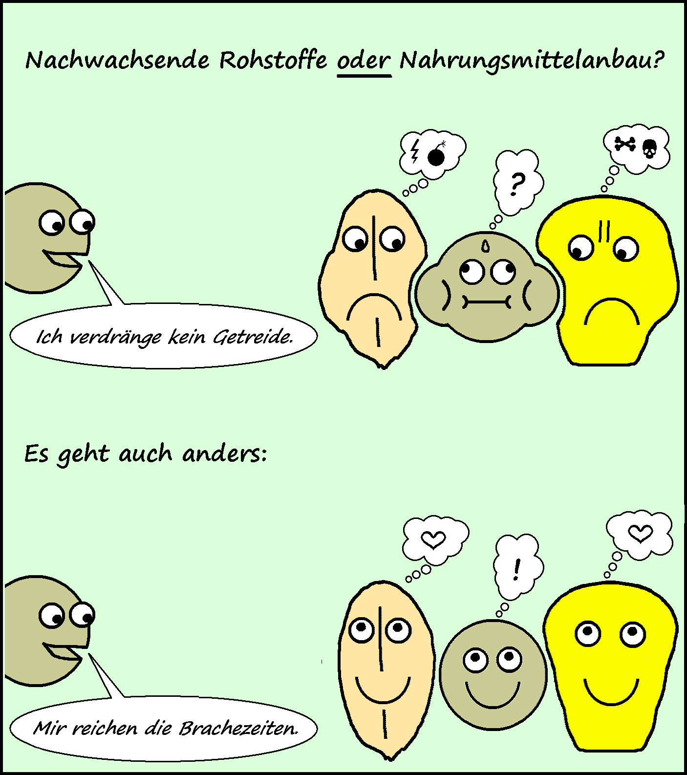 es werden keine Nahrungsmittel von ihren Anbauflächen verdrängt, so dass Menschen hungern, damit wir über Energie verfügen. Für den Anbau der Energiepflanzen nutzen wir bestehende landwirtschaftliche Strukturen, d.h. Landwirte mit großen Anbauflächen für Getreide oder Sonnenblumen. Unsere Energiepflanze kann nach nur 92 Tagen geerntet werden, nutzt die Brachezeiten auf Flächen für den Getreideanbau, sorgt für den nötigen Fruchtwechsel und erhöht den Ertrag des darauf folgenden Getreideanbaus. Fruchtwechsel mit Getreide: |