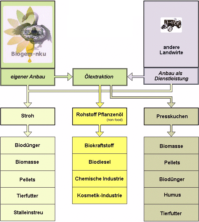 Nahrungsmittelanbau genutzt werden. Wir pachten Land, das gerade brach liegt, für die Dauer des Anbaus unserer Energiepflanze und bauen sie selbst an oder lassen Landwirte sie auf ihrem Land anbauen und zahlen für diese Dienstleistung einen vertraglich vereinbarten Festpreis pro Tonne der geernteten Samen. Anschließend produzieren wir aus den Samen den Rohstoff "energetisches Pflanzenöl". Anbau und Verwendung unserer Energiepflanze: |