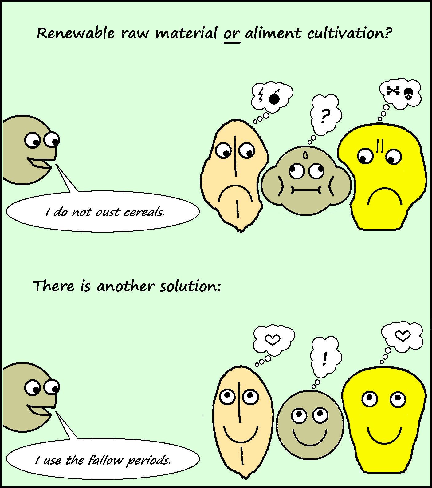 and no crowding out of aliments from their acreages, so that people starve while we command energy. For cultivating the energy crop we use existent agricultural structures and farmers with large acreages for cereals or sunflowers. Our energy crop can be harvested after 92 days only, it uses for growing the fallow periods of cereal cultivartion, cares for the needed crop rotation and increases the gain of the following cereal cultivation. Crop rotation with cereals: |