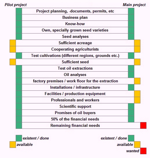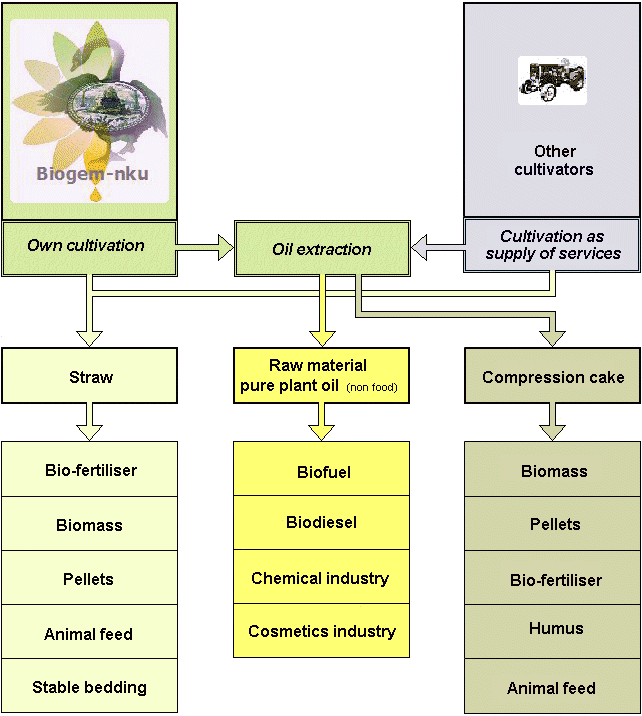 aliment cultivation. We rent acreages during their fellow periods for the duration of cultivating our energy crop and grow it by ourself or we let farmers cultivate our seeds as service providers and pay them a contractually fixed price per ton of harvested seeds. Afterwards we produce from those the raw material "energetic pure plant oil". Cultivation and use of our energy crop: |
